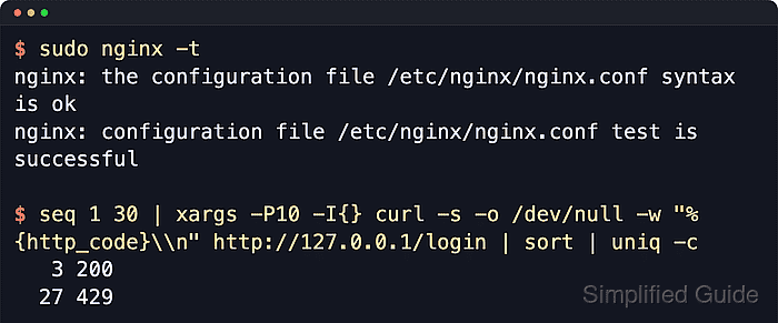 $ seq 1 30 | xargs -P10 -I{} curl -s -o /dev/null -w "%{http_code}\n" http://127.0.0.1/login | sort | uniq -c 3 200 27 429Use the real protected hostname instead of 127.0.0.1 when the limiter lives in a non-default virtual host.