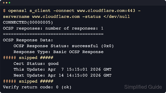 $ openssl s_client -connect example.com:443 -servername example.com -status </dev/null CONNECTED(00000005) OCSP responses: number of responses: 1 ====================================== OCSP Response Data: OCSP Response Status: successful (0x0) Response Type: Basic OCSP Response ##### snipped ##### Cert Status: good ##### snipped ##### Verify return code: 0 (ok)Older OpenSSL builds can print OCSP response: instead of OCSP responses: number of responses: 1. Successful stapling is proved by a responder section with OCSP Response Status: successful (0x0) and Cert Status: good.