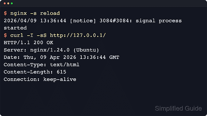 Always test the configuration before a reload or restart because service management still depends on Nginx accepting the files it needs to load. The steps below are aligned with the current packaged Ubuntu unit behavior verified on April 9, 2026, and they call out the direct nginx -s fallback for older, minimal, or containerized hosts that do not use systemd.