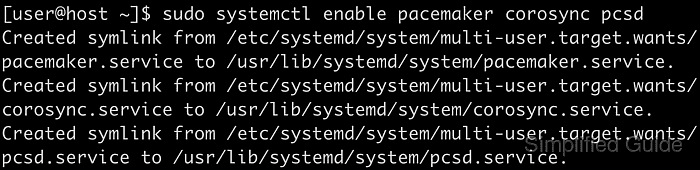 $ sudo systemctl enable pacemaker corosync Created symlink /etc/systemd/system/multi-user.target.wants/pacemaker.service -> /usr/lib/systemd/system/pacemaker.service. Created symlink /etc/systemd/system/multi-user.target.wants/corosync.service -> /usr/lib/systemd/system/corosync.service.