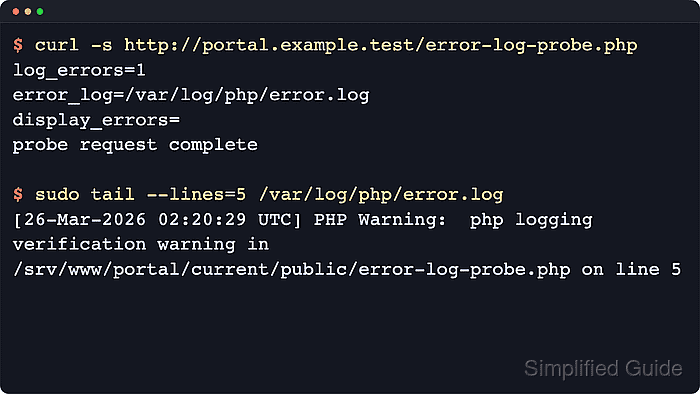 $ sudo tail --lines=5 /var/log/php/error.log [26-Mar-2026 02:20:29 UTC] PHP Warning: php logging verification warning in /srv/www/portal/current/public/error-log-probe.php on line 5