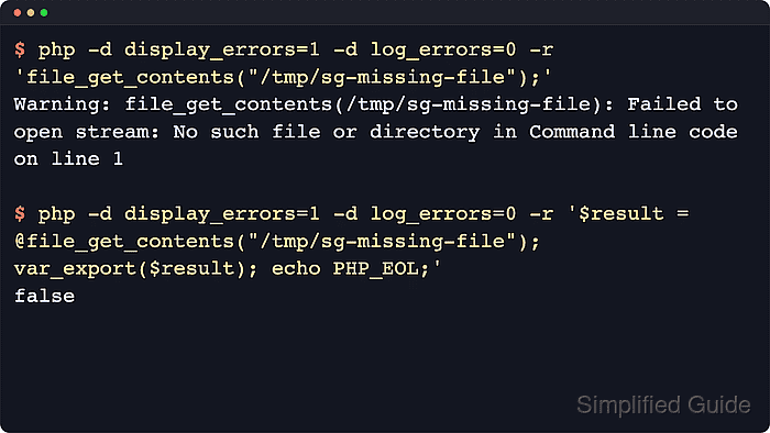 $ php -d display_errors=1 -d log_errors=0 -r '$result = @file_get_contents("/tmp/sg-missing-file"); if ($result === false) { echo "using built-in application defaults".PHP_EOL; }' using built-in application defaultsUse a direct guard such as is_file(), isset(), or array_key_exists() when one is available, because avoiding the warning is usually safer than suppressing it after the fact.