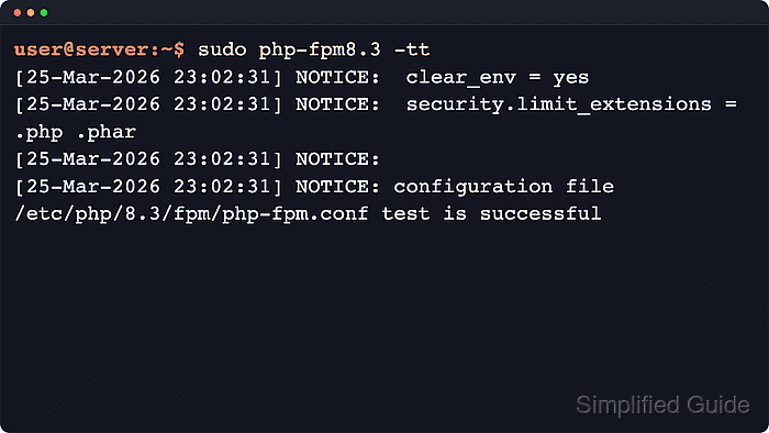 $ sudo php-fpm8.3 -tt [25-Mar-2026 23:02:31] NOTICE: clear_env = yes [25-Mar-2026 23:02:31] NOTICE: security.limit_extensions = .php .phar [25-Mar-2026 23:02:31] NOTICE: [25-Mar-2026 23:02:31] NOTICE: configuration file /etc/php/8.3/fpm/php-fpm.conf test is successful