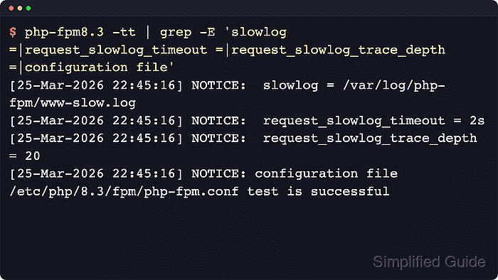 $ sudo php-fpm8.3 -tt | grep -E 'slowlog =|request_slowlog_timeout =|request_slowlog_trace_depth =|configuration file' [25-Mar-2026 22:45:16] NOTICE: slowlog = /var/log/php-fpm/www-slow.log [25-Mar-2026 22:45:16] NOTICE: request_slowlog_timeout = 2s [25-Mar-2026 22:45:16] NOTICE: request_slowlog_trace_depth = 20 [25-Mar-2026 22:45:16] NOTICE: configuration file /etc/php/8.3/fpm/php-fpm.conf test is successful