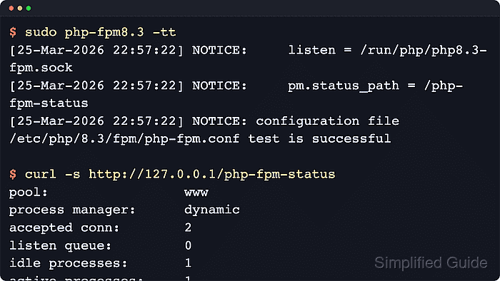 $ sudo php-fpm8.3 -tt 2>&1 | grep -E 'listen =|pm.status_path =|configuration file' [26-Mar-2026 02:20:24] NOTICE: listen = /run/php/php8.3-fpm.sock [26-Mar-2026 02:20:24] NOTICE: pm.status_path = /php-fpm-status [26-Mar-2026 02:20:24] NOTICE: configuration file /etc/php/8.3/fpm/php-fpm.conf test is successful