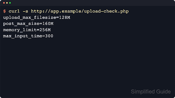 $ curl -s https://app.example.test/upload-check.php SAPI=fpm-fcgi Loaded php.ini=/etc/php/8.3/fpm/php.ini upload_max_filesize=128M post_max_size=160M memory_limit=256M max_input_time=300