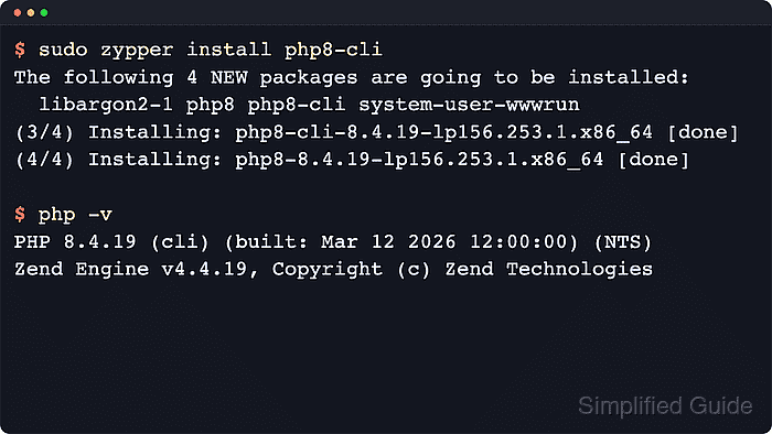 $ rpm -q php8 php8-cli php8-8.4.19-lp156.253.1.x86_64 php8-cli-8.4.19-lp156.253.1.x86_64 $ php -r 'printf("PHP_VERSION=%s\nPHP_SAPI=%s\n", PHP_VERSION, PHP_SAPI);' PHP_VERSION=8.4.19 PHP_SAPI=cliThe package release string varies by branch, but the installed php8 and php8-cli packages should resolve to the same build.