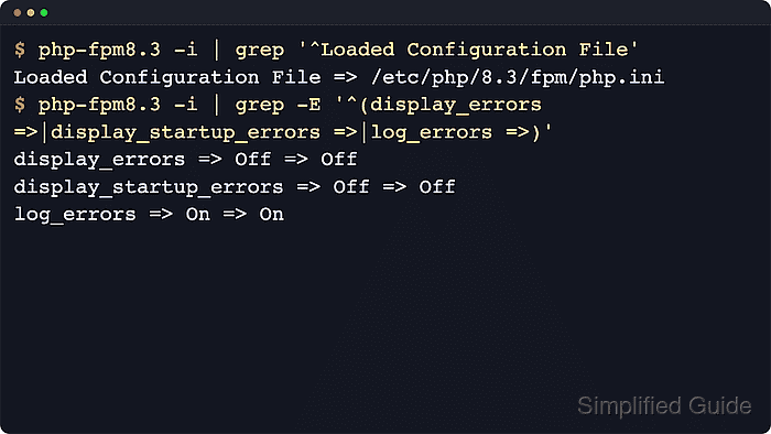 $ php-fpm8.3 -i | grep -E '^(Loaded Configuration File|display_errors =>|display_startup_errors =>|error_reporting =>|log_errors =>)' Loaded Configuration File => /etc/php/8.3/fpm/php.ini display_errors => Off => Off display_startup_errors => Off => Off error_reporting => 32767 => 32767 log_errors => On => On