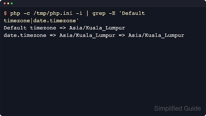 $ php -c /etc/php/8.3/fpm/php.ini -i | grep -E 'Loaded Configuration File|Default timezone|date.timezone' Loaded Configuration File => /etc/php/8.3/fpm/php.ini Default timezone => Asia/Kuala_Lumpur date.timezone => Asia/Kuala_Lumpur => Asia/Kuala_Lumpur