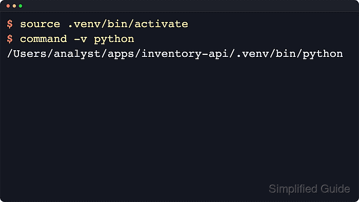 $ command -v python /Users/analyst/apps/inventory-api/.venv/bin/python $ command -v pip /Users/analyst/apps/inventory-api/.venv/bin/pip