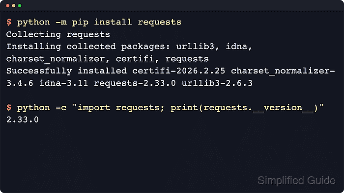 $ python -m pip show requests Name: requests Version: 2.33.0 Summary: Python HTTP for Humans. Location: /home/user/project/.venv/lib/python3.14/site-packages Requires: certifi, charset_normalizer, idna, urllib3 $ python -c "import requests; print(requests.__version__)" 2.33.0