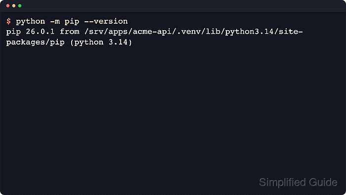 $ source .venv/bin/activate (.venv) $ python -m pip --version pip 26.0.1 from /srv/apps/acme-api/.venv/lib/python3.14/site-packages/pip (python 3.14)