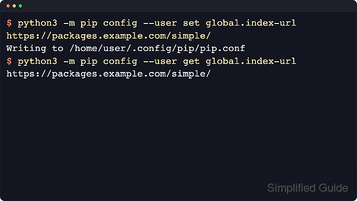 $ python3 -m pip config --user set global.index-url https://packages.example.com/api/pypi/python/simple/ Writing to /home/<username>/.config/pip/pip.conf