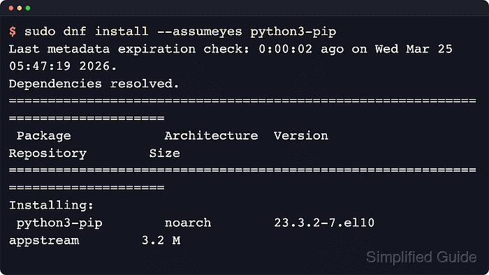 $ sudo dnf install --assumeyes python3-pip CentOS Stream 10 - BaseOS 1.8 MB/s | 9.4 MB 00:05 CentOS Stream 10 - AppStream 421 kB/s | 3.5 MB 00:08 CentOS Stream 10 - Extras packages 3.8 kB/s | 10 kB 00:02 Dependencies resolved. ================================================================================ Package Architecture Version Repository Size ================================================================================ Installing: python3-pip noarch 23.3.2-7.el10 appstream 3.2 M Transaction Summary ================================================================================ Install 1 Package Downloading Packages: python3-pip-23.3.2-7.el10.noarch.rpm 690 kB/s | 3.2 MB 00:04 Running transaction Installing : python3-pip-23.3.2-7.el10.noarch 1/1 Installed: python3-pip-23.3.2-7.el10.noarch Complete!