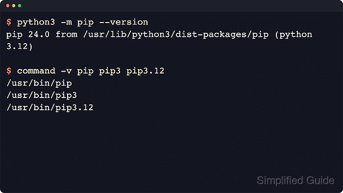 $ python3 -m pip --version pip 24.0 from /usr/lib/python3/dist-packages/pip (python 3.12) $ command -v pip pip3 pip3.12 /usr/bin/pip /usr/bin/pip3 /usr/bin/pip3.12
