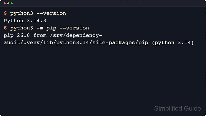 $ python3 -m pip --version pip 26.0.1 from /srv/dependency-audit/.venv/lib/python3.14/site-packages/pip (python 3.14)