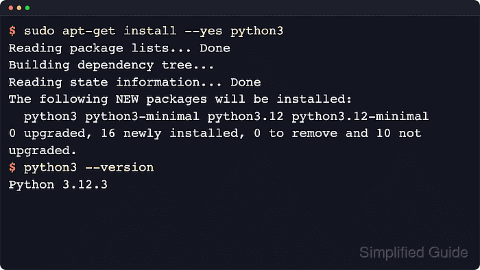 $ sudo apt-get install --yes python3 Reading package lists... Done Building dependency tree... Done Reading state information... Done The following NEW packages will be installed: python3 python3-minimal python3.12 python3.12-minimal ##### snipped ##### Setting up python3 (3.12.3-0ubuntu2.1) ...
