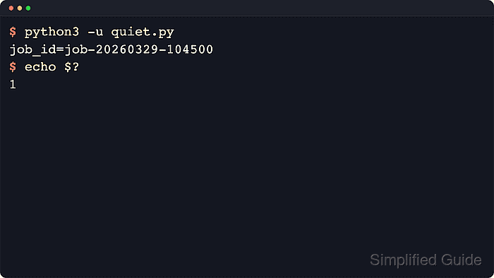 $ python3 -u quiet.py job_id=job-20260329-104500 $ echo $? 1