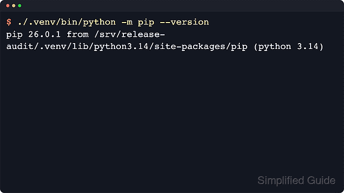 $ ./.venv/bin/python -m pip --version pip 26.0.1 from /srv/release-audit/.venv/lib/python3.14/site-packages/pip (python 3.14)
