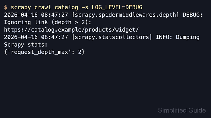 $ scrapy crawl catalog -s LOG_LEVEL=DEBUG 2026-04-16 08:47:27 [scrapy.spidermiddlewares.depth] DEBUG: Ignoring link (depth > 2): https://catalog.example/products/widget/ ##### snipped ##### 2026-04-16 08:47:27 [scrapy.core.engine] INFO: Spider closed (finished)