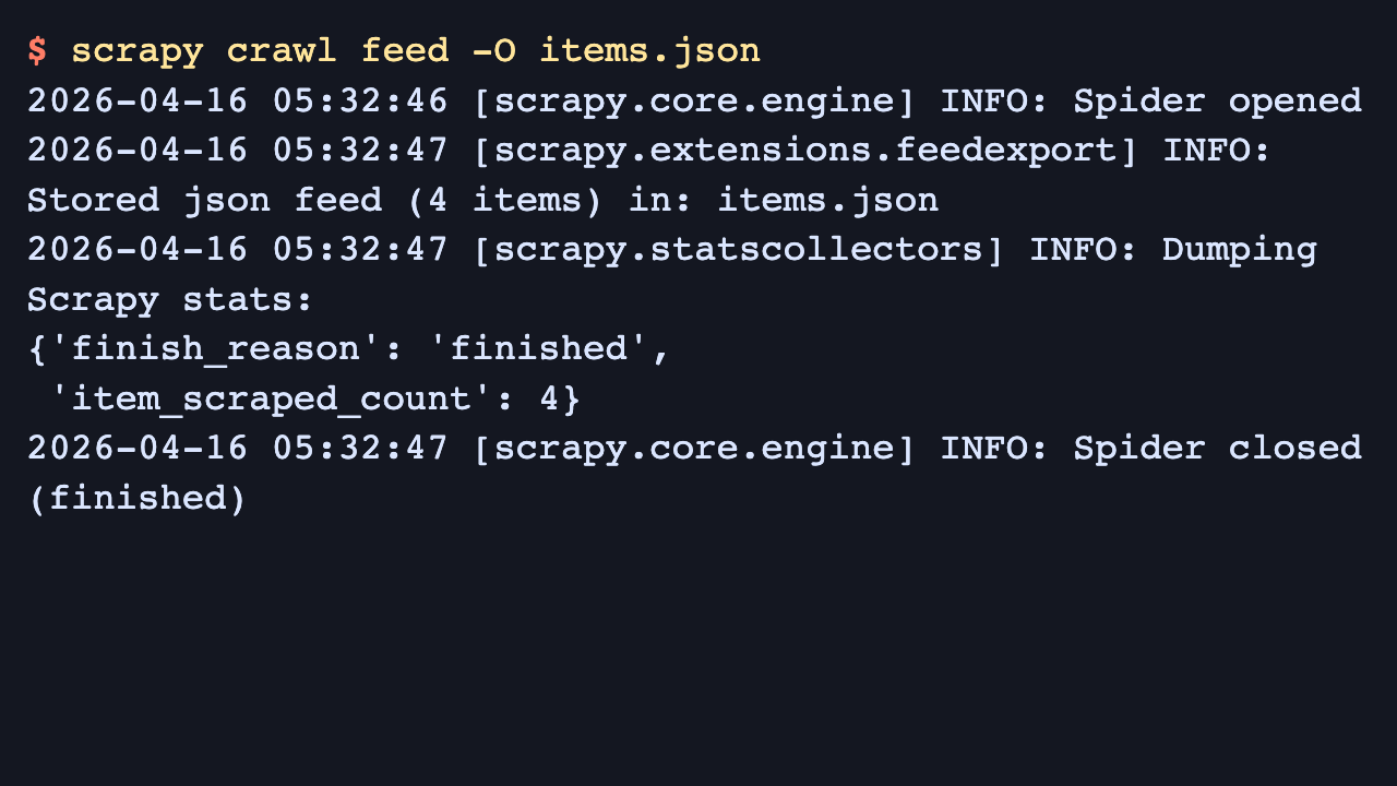 $ scrapy crawl feed -O items.json 2026-04-21 21:50:40 [scrapy.core.engine] INFO: Spider opened 2026-04-21 21:50:41 [scrapy.extensions.feedexport] INFO: Stored json feed (4 items) in: items.json 2026-04-21 21:50:41 [scrapy.statscollectors] INFO: Dumping Scrapy stats: {'finish_reason': 'finished', 'item_scraped_count': 4} 2026-04-21 21:50:41 [scrapy.core.engine] INFO: Spider closed (finished)Infinite scrolling endpoints are often rate limited and can still be covered by robots.txt rules, so keep delays conservative and confirm the site's crawling policy before scaling the spider up.