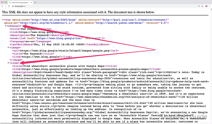 Notice that it's basically an XML document. Blog posts are in channel→item elements.