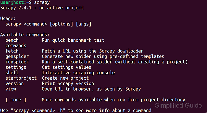 $ scrapy Scrapy 2.4.1 - no active project Usage: scrapy <command> [options] [args] Available commands: bench Run quick benchmark test commands fetch Fetch a URL using the Scrapy downloader genspider Generate new spider using pre-defined templates runspider Run a self-contained spider (without creating a project) settings Get settings values shell Interactive scraping console startproject Create new project version Print Scrapy version view Open URL in browser, as seen by Scrapy [ more ] More commands available when run from project directory Use "scrapy <command> -h" to see more info about a command