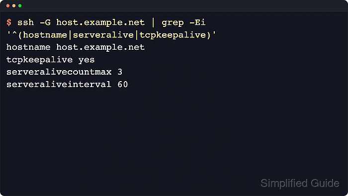 $ ssh -G host.example.net ##### snipped ##### hostname host.example.net tcpkeepalive yes serveralivecountmax 3 serveraliveinterval 60 ##### snipped #####