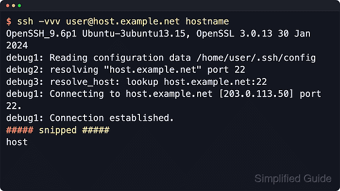 $ ssh -v user@host.example.net hostname OpenSSH_9.6p1 Ubuntu-3ubuntu13.15, OpenSSL 3.0.13 30 Jan 2024 debug1: Reading configuration data /home/user/.ssh/config debug1: Connecting to host.example.net [203.0.113.50] port 22. debug1: Connection established. debug1: Authenticating to host.example.net:22 as 'user' ##### snipped ##### host