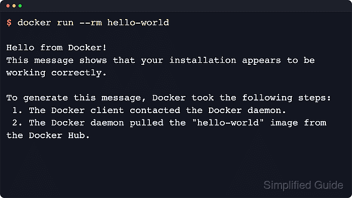 - Run the hello-world container to verify that the client can reach the daemon and start containers.