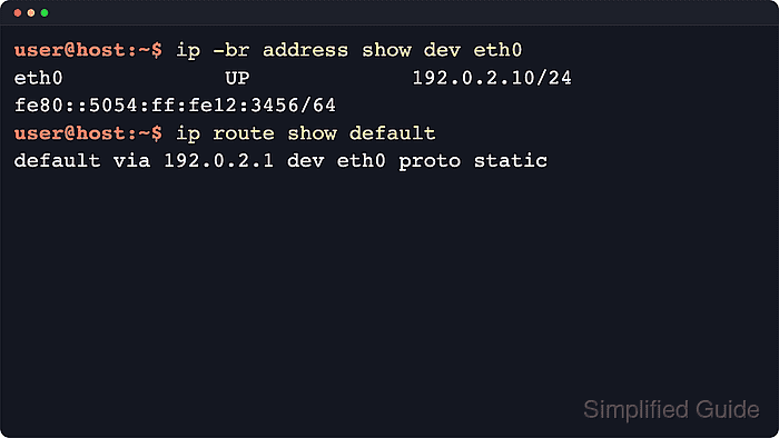$ ip -br address show dev eth0 eth0 UP 192.0.2.10/24 fe80::5054:ff:fe12:3456/64 $ ip route show default default via 192.0.2.1 dev eth0 proto static metric 100