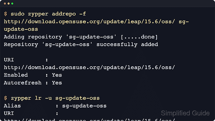 $ sudo zypper addrepo -f http://download.opensuse.org/update/leap/15.6/oss/ sg-update-oss Adding repository 'sg-update-oss' [.....done] Repository 'sg-update-oss' successfully added URI : http://download.opensuse.org/update/leap/15.6/oss/ Enabled : Yes GPG Check : Yes Autorefresh : Yes Priority : 99 (default priority)