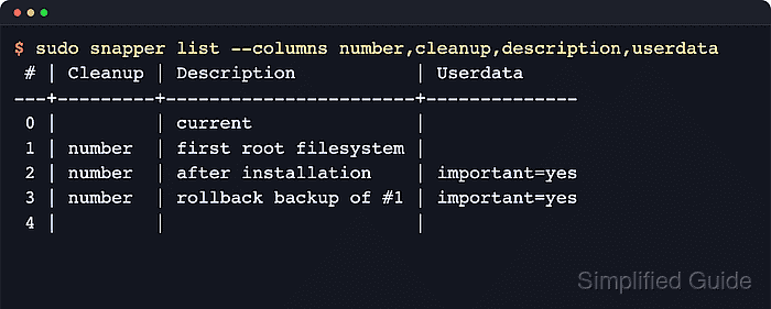 $ sudo snapper list --columns number,cleanup,description,userdata # | Cleanup | Description | Userdata ---+---------+-----------------------+-------------- 0 | | current | 1 | number | first root filesystem | 2 | number | after installation | important=yes 3 | number | rollback backup of #1 | important=yes 4 | | |