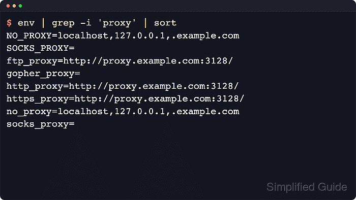 $ env | grep -i 'proxy' | sort NO_PROXY=localhost,127.0.0.1,.example.com SOCKS_PROXY= ftp_proxy=http://proxy.example.com:3128/ gopher_proxy= http_proxy=http://proxy.example.com:3128/ https_proxy=http://proxy.example.com:3128/ no_proxy=localhost,127.0.0.1,.example.com socks_proxy=