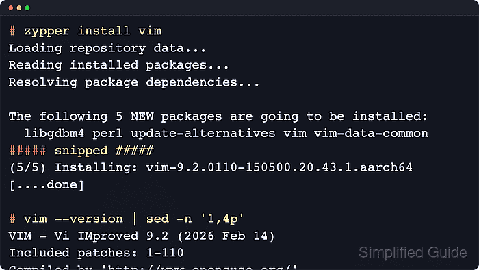 $ sudo zypper install vim Loading repository data... Reading installed packages... Resolving package dependencies... The following 4 NEW packages are going to be installed: libgdbm4 perl vim vim-data-common 4 new packages to install. ##### snipped ##### (4/4) Installing: vim-9.1.0330-150500.20.12.1.aarch64 [.....done] update-alternatives: using /usr/bin/vim-nox11 to provide /usr/bin/vim (vim) in auto mode