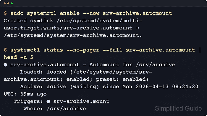 $ systemctl status --no-pager --full srv-archive.automount | head -n 5 ● srv-archive.automount - Automount for /srv/archive Loaded: loaded (/etc/systemd/system/srv-archive.automount; enabled; preset: enabled) Active: active (waiting) since Mon 2026-04-13 08:24:20 UTC; 69ms ago Triggers: ● srv-archive.mount Where: /srv/archiveThe active (waiting) state is the success condition before the first access. It means the path is armed and ready to trigger the mount unit.
