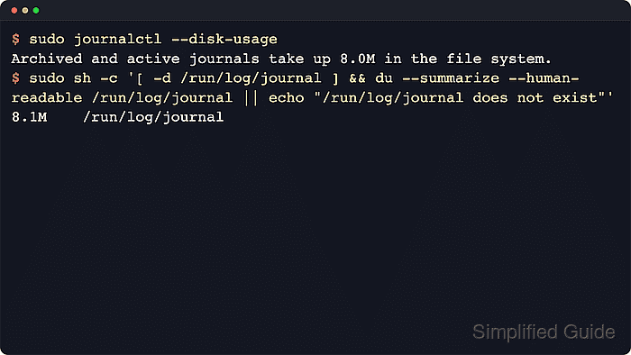 $ sudo sh -c '[ -d /run/log/journal ] && du --summarize --human-readable /run/log/journal || echo "/run/log/journal does not exist"' 8.1M /run/log/journal