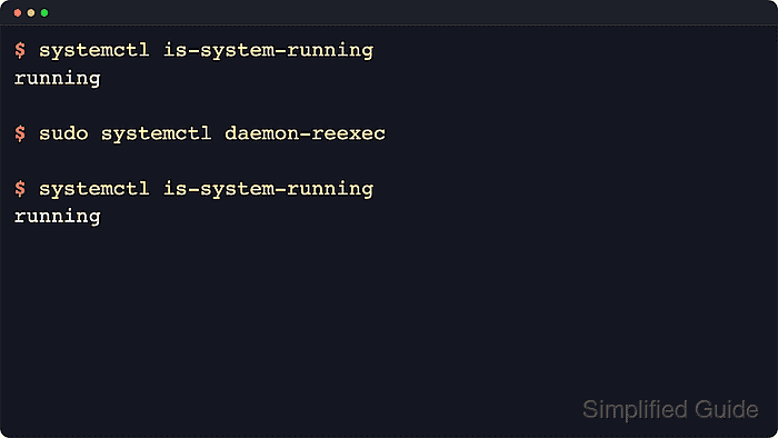 Examples below target the system manager and use sudo. This operation is mainly meant for upgrades and debugging, so it is worth checking the current manager state first and keeping console or out-of-band access available on critical hosts. If unit files were edited, run daemon-reload separately because reexecuting the manager does not reparse changed unit definitions on its own.