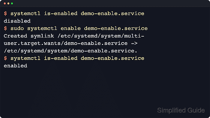 Examples below use demo-enable.service as a stand-in unit name so the before-and-after state stays clear; replace it with the real unit on the host. If a local unit file was just added or edited under /etc/systemd/system/, reload the manager first so the new definition is visible, remember that static, masked, and template-only units cannot always be enabled the same way as a normal service unit, and use systemctl --user enable instead of the system manager command for per-user services.