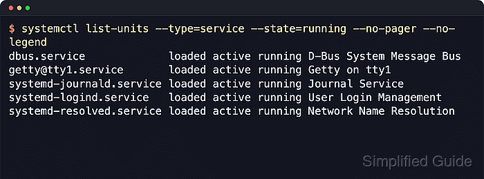 $ systemctl list-units --type=service --state=running --no-pager --no-legend dbus.service loaded active running D-Bus System Message Bus getty@tty1.service loaded active running Getty on tty1 systemd-journald.service loaded active running Journal Service systemd-logind.service loaded active running User Login Management systemd-resolved.service loaded active running Network Name Resolution