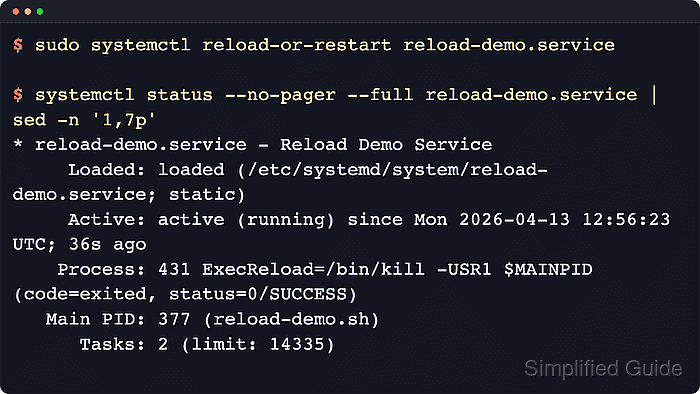 $ sudo systemctl reload-or-restart reload-demo.service $ systemctl status --no-pager --full reload-demo.service | sed -n '1,7p' * reload-demo.service - Reload Demo Service Loaded: loaded (/etc/systemd/system/reload-demo.service; static) Active: active (running) since Mon 2026-04-13 12:56:23 UTC; 36s ago Process: 431 ExecReload=/bin/kill -USR1 $MAINPID (code=exited, status=0/SUCCESS) Main PID: 377 (reload-demo.sh) Tasks: 2 (limit: 14335)The same MainPID before and after the command, plus the populated ExecReload result, shows that systemd reloaded the service instead of restarting it.