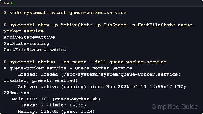 $ systemctl status --no-pager --full queue-worker.service * queue-worker.service - Queue Worker Service Loaded: loaded (/etc/systemd/system/queue-worker.service; disabled; preset: enabled) Active: active (running) since Mon 2026-04-13 12:55:17 UTC; 228ms ago Main PID: 101 (queue-worker.sh) ##### snipped #####A Type=oneshot unit with RemainAfterExit=yes can legitimately show active (exited) after a successful start, while oneshot units without RemainAfterExit can return to dead immediately after the start action finishes.