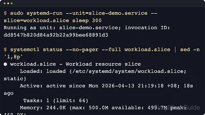 $ systemctl show -p CPUWeight -p MemoryMax -p TasksMax workload.slice CPUWeight=200 MemoryMax=524288000 TasksMax=64 $ systemctl status --no-pager --full workload.slice | sed -n '1,12p' ● workload.slice - Workload resource slice Loaded: loaded (/etc/systemd/system/workload.slice; static) Active: active since Mon 2026-04-13 21:19:18 +08; 18s ago Tasks: 1 (limit: 64) Memory: 244.0K (max: 500.0M available: 499.7M peak: 460.0K) CPU: 1ms CGroup: /workload.slice └─slice-demo.service └─1636 /usr/bin/sleep 300systemctl show returns the normalized property values, so MemoryMax prints bytes. The status view is easier for human inspection because it also shows the current task count, memory usage, and the child service tree.