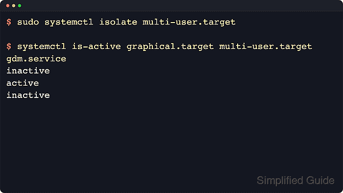 $ sudo systemctl isolate graphical.target $ systemctl is-active graphical.target multi-user.target gdm.service active active active