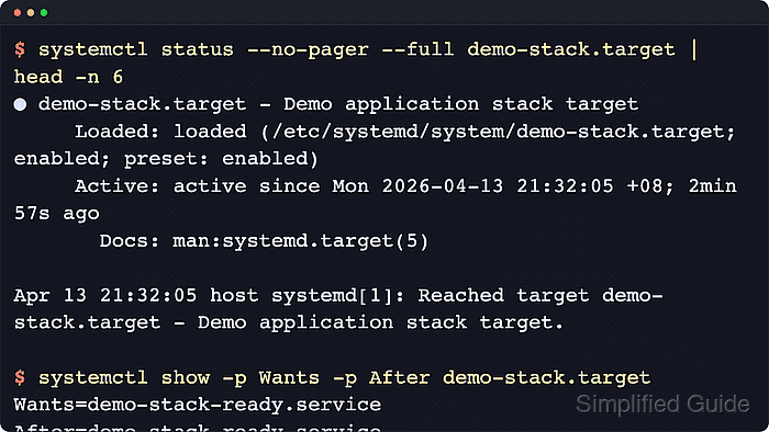 $ systemctl status --no-pager --full demo-stack.target | head -n 6 ● demo-stack.target - Demo application stack target Loaded: loaded (/etc/systemd/system/demo-stack.target; enabled; preset: enabled) Active: active since Mon 2026-04-13 21:32:05 +08; 2min 57s ago Docs: man:systemd.target(5) Apr 13 21:32:05 host systemd[1]: Reached target demo-stack.target - Demo application stack target. $ systemctl show -p Wants -p After demo-stack.target Wants=demo-stack-ready.service After=demo-stack-ready.serviceThe success state for the target itself is Active: active together with the expected member unit in Wants=. Current upstream target-unit rules also automatically add the matching After= ordering dependency for Wants= and Requires= relationships unless default dependencies are disabled.