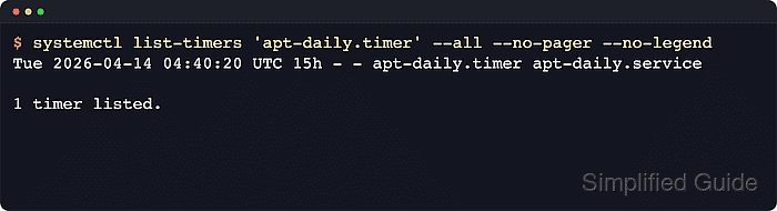 $ systemctl list-timers 'apt-daily.timer' --all --no-pager --no-legend Tue 2026-04-14 04:40:20 UTC 15h - - apt-daily.timer apt-daily.service 1 timer listed.
