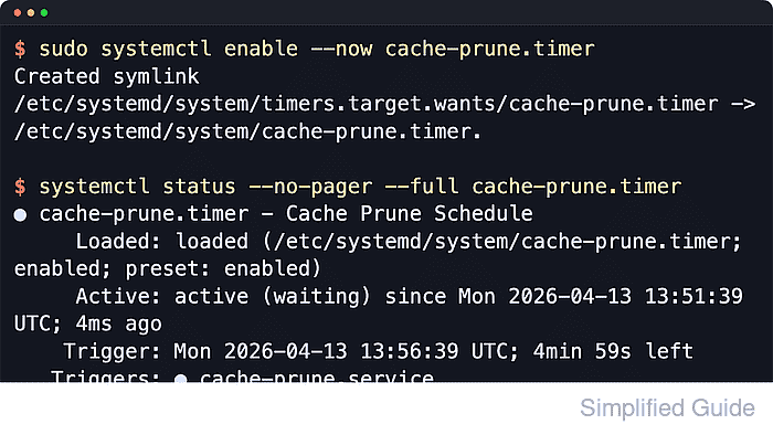 $ systemctl status --no-pager --full cache-prune.timer ● cache-prune.timer - Cache Prune Schedule Loaded: loaded (/etc/systemd/system/cache-prune.timer; disabled; preset: enabled) Active: active (waiting) since Mon 2026-04-13 13:50:34 UTC; 8s ago Trigger: Mon 2026-04-13 13:52:34 UTC; 1min 51s left Triggers: ● cache-prune.serviceReplace cache-prune.timer with the actual timer unit. Loaded: shows the unit file path and whether it is enabled for boot, Active: shows whether the timer is currently waiting or dead, Trigger: shows the next scheduled run, and Triggers: shows the unit that will be activated.