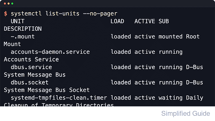 $ systemctl list-units --no-pager UNIT LOAD ACTIVE SUB DESCRIPTION -.mount loaded active mounted Root Mount accounts-daemon.service loaded active running Accounts Service dbus.service loaded active running D-Bus System Message Bus dbus.socket loaded active running D-Bus System Message Bus Socket systemd-tmpfiles-clean.timer loaded active waiting Daily Cleanup of Temporary Directories ##### snipped ##### 223 loaded units listed. Pass --all to see loaded but inactive units, too. To show all installed unit files use 'systemctl list-unit-files'.