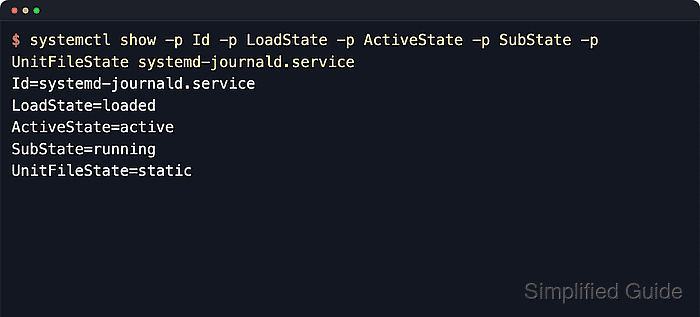 $ systemctl show -p Id -p LoadState -p ActiveState -p SubState -p UnitFileState systemd-journald.service Id=systemd-journald.service LoadState=loaded ActiveState=active SubState=running UnitFileState=static