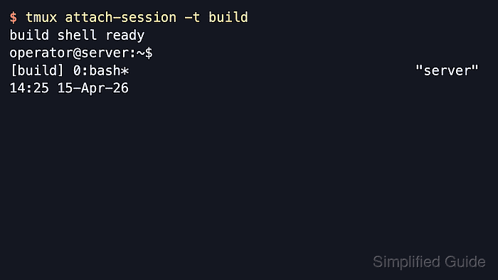$ tmux attach-session -t build build shell ready operator@server:~$ [build] 0:bash* "server" 14:25 15-Apr-26